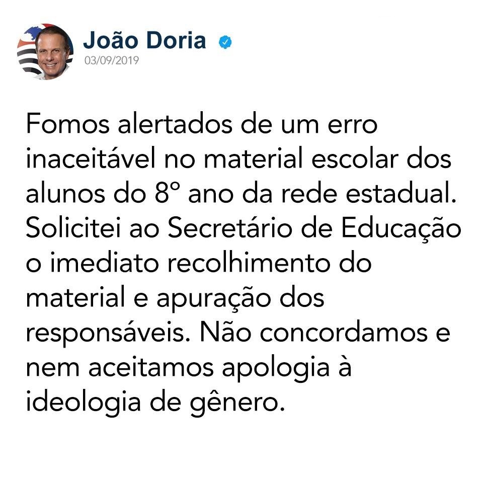 No episódio do recolhimento das apostilas em São Paulo, após a repercussão extremamente negativa do fato já no primeiro dia, Priscila Cruz, entrevista ao podcast do Estadão, em 4 de setembro, disse que considerava importante que a discussão de temas contemporâneos (como gênero) ocorresse nas escolas, mas pontificou: “sem doutrinação, é importante dizer isso” (confira no podcast, a partir de 15:55). Já no início da entrevista, a presidente do TPE ponderou que, diante das controvérsias sobre os debates de gênero nas escolas, é preciso tentar entender os valores dos grupos conservadores.